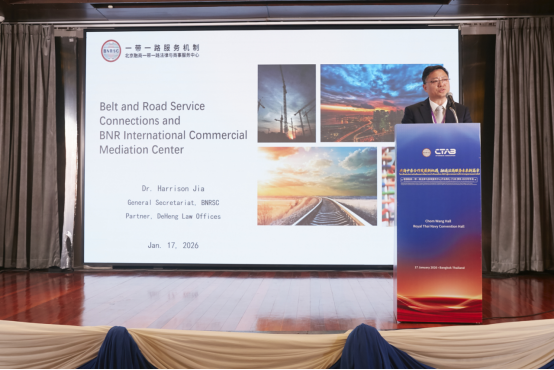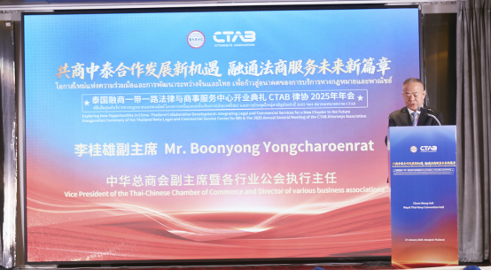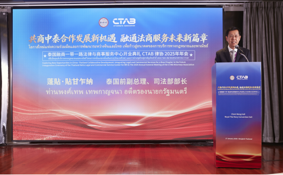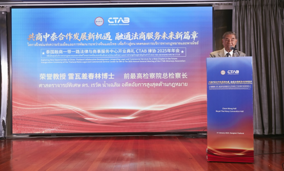 2026年1月17日下午,泰国融商一带一路法律与商事服务中心(“泰国融商中心”)开业典礼暨CTAB律协2025年年会在泰国曼谷海军议事厅隆重举办。本次活动以“共商中泰合作发展新机遇 融通法商服务未来新篇章”为主题,由一带一路服务机制、泰国融商一带一路法律与商事服务中心和CTAB律师协会主办,德恒律师事务所、暹罗律师事务所、中铁二十三局集团(泰国)有限公司、星暹日报、中泰会展产业商会协办。泰国最高检察院前总检察长雷瓦·差春林博士、泰国前副总理兼司法部长蓬贴·贴甘乍纳先生、一带一路服务机制主席王丽博士、泰国中华总商会副主席李桂雄先生、中国贸促会驻泰国代表处首席代表马艳玲女士、CTAB律师协会主席纳隆·萨吉卡瓦律师、席琳.荣颂亲王、一带一路服务机制香港共同主席萧咏仪女士等近200位中泰两国政商届重量级嘉宾现场参加。庆典活动由贾辉博士、华笑以博士、Peter Setthapong律师和马若彬先生主持。