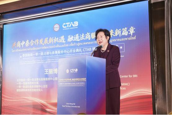 典礼现场,泰国最高检察院前总检察长雷瓦·差春林博士、泰国前副总理兼司法部长蓬贴·贴甘乍那先生、一带一路服务机制主席王丽博士、泰国中华总商会副主席李桂雄先生、中国贸促会驻泰国代表处首席代表马艳玲女士、CTAB律师协会主席纳隆·萨吉卡瓦律师等嘉宾先后致辞。
