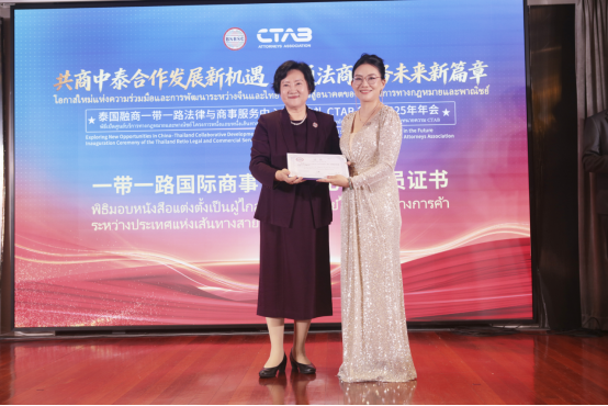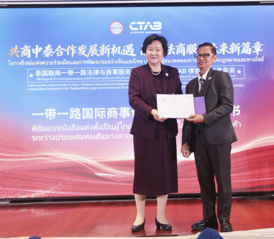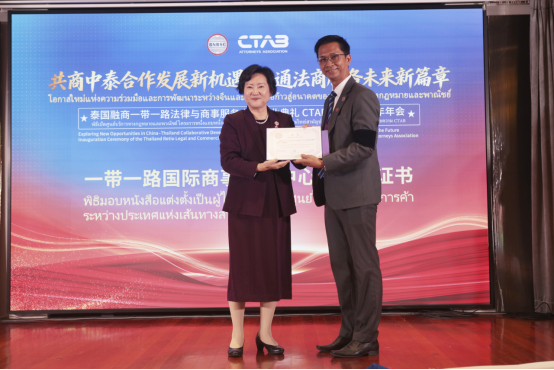 一带一路服务机制主席、北京融商一带一路法律与商事服务中心理事长王丽博士为首批十一位泰国和中国法律和商事专家颁发“一带一路国际商事调解中心”调解员证书,为未来中国和泰国之间商事争议调解解决奠定坚实基础。