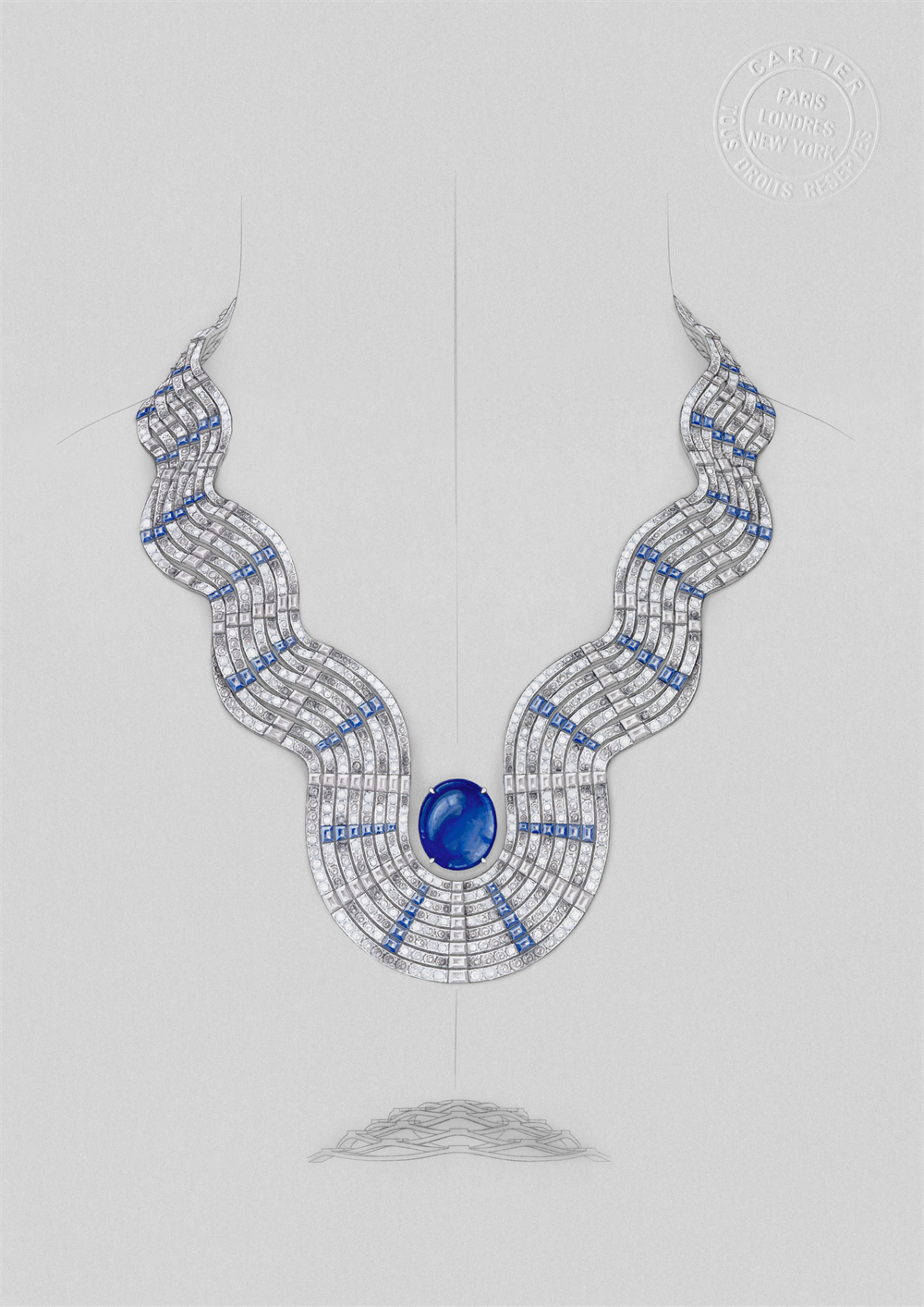 潋滟水波环绕着宝石起伏荡漾。为实现这一设计,品牌工匠尽可能精准调整镶嵌工艺与链节结构,令体量丰盈的波浪线条呈现柔软的形态。涡卷图案由铺镶钻石线条组成,其间以一系列横向排布的钻石或定制切割蓝宝石点缀,营造丰富的层次。这一设计对精准度要求极高,须悉心考量镂空布局,并打造与中央宝石浑然契合的构造,进而体现工匠的精深造诣。