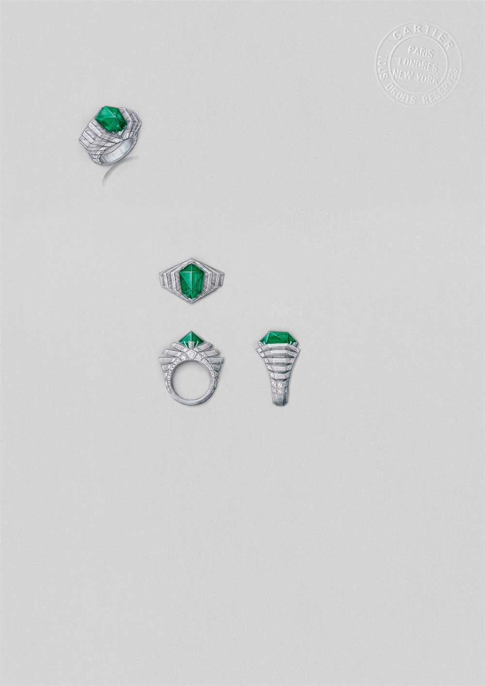 中心宝石充满几何美感的立体造型,启发卡地亚打造出层次分明的戒身结构,升华造型与材质之美。这一设计塑造出格外立体的深邃效果,令作品更显通透:祖母绿的绿色光芒透过澄莹的白水晶层层映射,后者自20世纪初便是品牌使用的标志性材质之一。