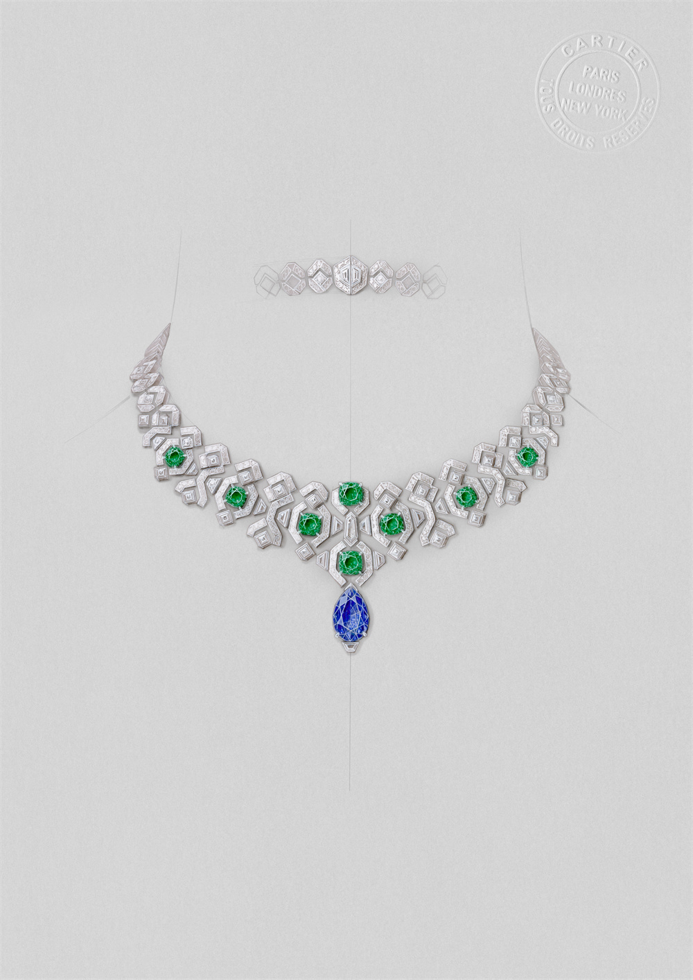 在这款项链中,一颗重达11.70克拉的斯里兰卡梨形蓝宝石和八颗总重8.94克拉的赞比亚祖母绿交相辉映,演绎卡地亚一个多世纪以来的标志性色彩组合。