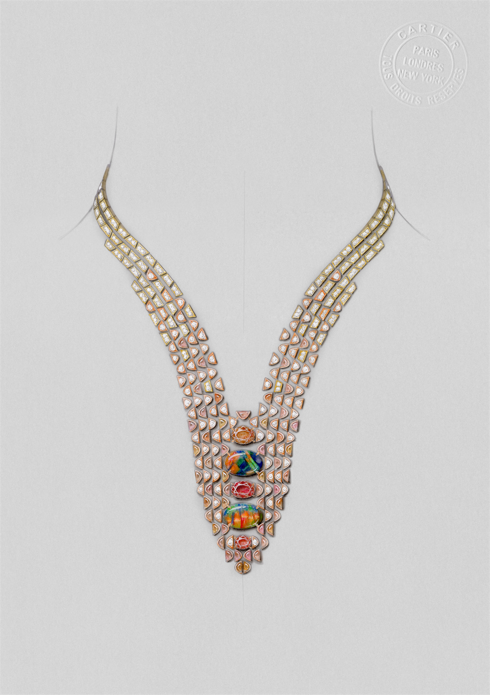 在这款作品中,卡地亚工匠通过珍贵材质呈现色彩的丰富表达,两颗绚丽迷人的欧泊被巧妙置于焦点位置。