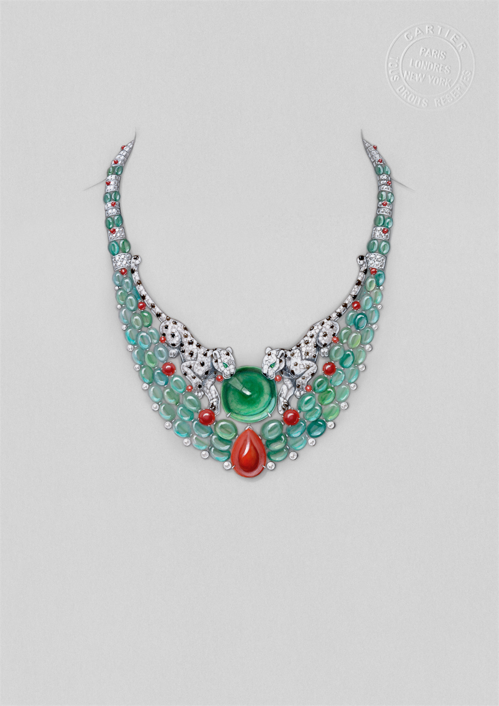 卡地亚延续一个多世纪的标志性红绿配色,与碧玺珠串的柔和质感相映成趣。得益于细致入微的串珠工艺,珠形碧玺呈现出恰到好处的垂坠感。卡地亚从丰富缤纷的色彩组合出发,以对称手法勾勒出两只两两相望、蓄势跳跃的猎豹。