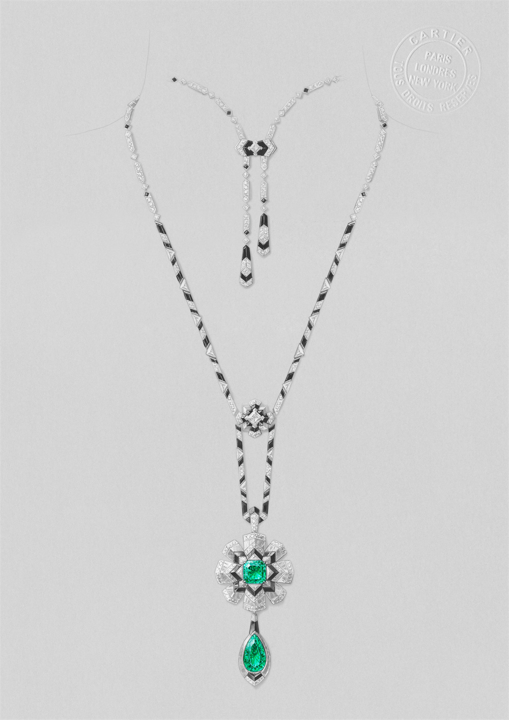 卡地亚珠宝师为这颗祖母绿特别设计了特殊的“隐形”镶嵌工艺,令宝石仿佛悬浮于空中,展现了卡地亚高级珠宝的精湛工艺。醒目的黑色缟玛瑙延展至镶钻链条,勾勒出作品整体轮廓,赋予作品立体的层次。作品造型风格醒目,极具感染力。